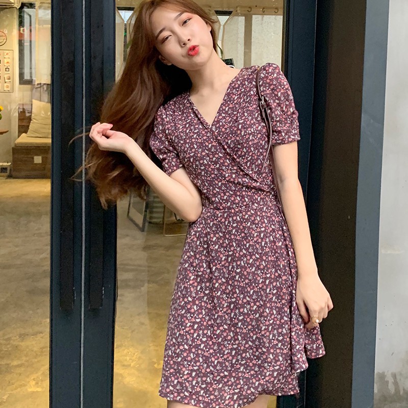 Dressbatik dengan model kerah v rempel, kerut dada, lengan pendek, sabuk terlepas dengan aksen kancing bungkus, kerut belakang.